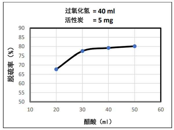 在本研究的最后三個(gè)樣本中,有H2O2和活性炭量是固定的,而乙酸的體積卻有所變化;旌衔镏幸宜岷康脑黾訒(huì)導(dǎo)致脫硫百分比的增加,因?yàn)榘l(fā)現(xiàn)乙酸具有比其他酸更好的氧化脫硫效果,而且大量的乙酸會(huì)導(dǎo)致過(guò)乙酸(CH3COOOH)的增加乙酸和(H2O2)之間的反應(yīng)產(chǎn)生的水量。(CH3COOOH)將與大量的硫化物反應(yīng),并將其氧化為砜或亞砜。該研究的結(jié)果顯示在圖(3)中。
