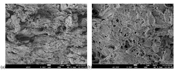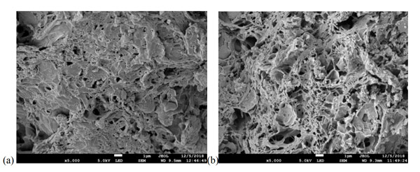 根據(jù)觀察到的活性炭微觀結(jié)構(gòu)來進(jìn)行形態(tài)研究。圖1顯示了在650°C(a)和850°C(b)兩種不同溫度下用25%H3PO4制成的活性炭的比較?梢钥闯,與650℃相比,在850℃下制備的活性炭具有稍大的孔?梢缘弥左w積隨著活化溫度的升高而逐漸增加。