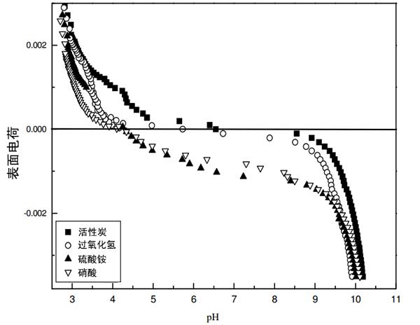 選擇用于改性活性炭表面的試劑都是氧化劑,目的是增加表面官能團(tuán)的密度。從改性活性炭的化學(xué)表征結(jié)果可以看出,該任務(wù)成功實(shí)現(xiàn)。從圖1中可以看出,從活性炭和幾種氧化的活性炭動(dòng)的酸度以相同的順序增加。酸度增加是由于存在羧基,酚類等酸性基團(tuán)。