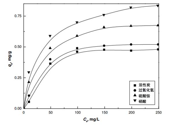 用活性炭和改性活性炭進(jìn)行平衡吸附實(shí)驗(yàn),以評估它們使用合成的鎳廢水從水性介質(zhì)中除去二價(jià)鎳的能力。通過用0.1g活性炭與50mL濃度范圍為10mg/L至250mg/L的Ni(II)溶液平衡進(jìn)行實(shí)驗(yàn),結(jié)果顯示在圖2中;钚蕴康拿靠宋饺萘恐蛋匆韵马樞蛟黾樱夯钚蕴>過氧化氫>硫酸銨>濃硝酸。氧化活性炭的容量增加是由于存在大量酸性基團(tuán),其可以與水溶液中存在的陽離子鎳交換它們的質(zhì)子。