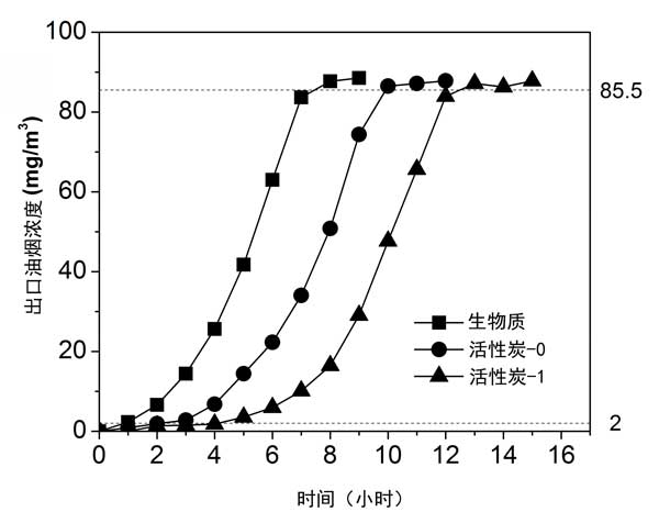 圖2:烹調(diào)煙氣的不同吸附劑的吸附穿透曲線。