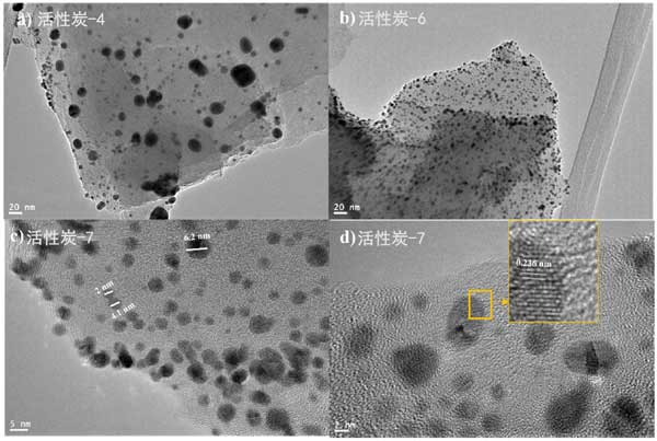 為了進一步研究金顆粒在活性炭表面的分布和結晶度,我們拍攝了鍍金活性炭樣品的透射電子顯微鏡圖像。圖7顯示了各種活性炭樣品在不同放大倍數(shù)下的TEM圖像。圖2a、b顯示了金納米粒子在活性炭表面上的分布。很明顯,兩個樣本的分布是均勻的。活性炭-4和活性炭-6似乎都以類似的方式相互作用和承載金納米粒子;钚蕴-7樣品的高分辨率TEM圖像如圖2c、d所示。圖2c顯示大多數(shù)金納米顆粒很小,直徑為3-5nm,并且只能看到少數(shù)團聚顆粒。圖2d顯示了金的晶格條紋間距。發(fā)現(xiàn)晶格條紋間距為0.217nm,對應于金晶面的面。此外,我們試圖通過TEM圖像估計顆粒尺寸的分布,我們發(fā)現(xiàn)所有樣品中超過80%的金顆粒的尺寸小于5nm。