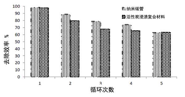 活性炭復(fù)合材料的再生具有經(jīng)濟(jì)重要性。該實(shí)驗(yàn)涉及許多吸附-解吸循環(huán),以估計(jì)重復(fù)脫色對(duì)納米材料吸附效率的影響。發(fā)現(xiàn)納米碳管和活性炭浸漬材料對(duì)活性紅的去除效率略有變化,如圖3所示。數(shù)據(jù)顯示原始納米碳管和活性炭浸漬材料存在差異與不同初始活性紅染料濃度下重復(fù)使用的納米化合物相比;钚约t的吸收程度在第一個(gè)循環(huán)后達(dá)到98.18%,然后在五輪納米碳管后降低到62.72%,而對(duì)于活性炭浸漬材料,第一個(gè)循環(huán)去除效率為97.72%,在第一個(gè)循環(huán)后,在五輪后降低到63.18%,表明其再生有效性,如圖3所示。因此,可以得出結(jié)論,納米碳管和活性炭浸漬材料的吸附過程會(huì)受到延長重復(fù)使用周期的影響,而不會(huì)損失大量染料吸附能力。因此,兩種納米化合物被多次用于從水性階段去除活性紅染料。因此,這表明它們可以多次使用,證明了它們的經(jīng)濟(jì)可行性。