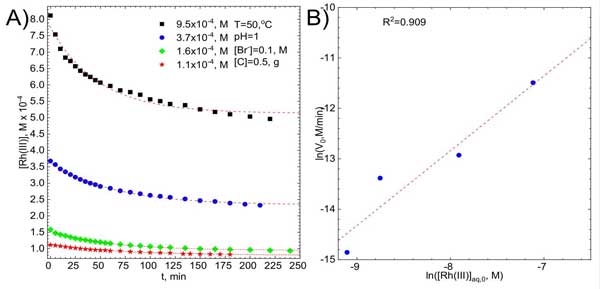 很明顯,銠溴化物絡(luò)離子的初始濃度將影響它們在電解質(zhì)中的平衡濃度和吸附過程的速率。這是圖2A,其中繪制了在T=50℃下在攪拌溶液中獲得的動力學(xué)曲線,攪拌速率為1200rpm。得到離子之間的線性相關(guān)性,確定系數(shù)接近圖2B。擬合線的斜率等于1.48±0.33,證實(shí)了初始假設(shè),即關(guān)于銠溴化物絡(luò)離子初始濃度的反應(yīng)的第一級。吸附動力學(xué)還應(yīng)取決于活性炭的表面積,前提是系統(tǒng)不受擴(kuò)散控制。這已針對不同濃度的吸附劑進(jìn)行了驗(yàn)證。
