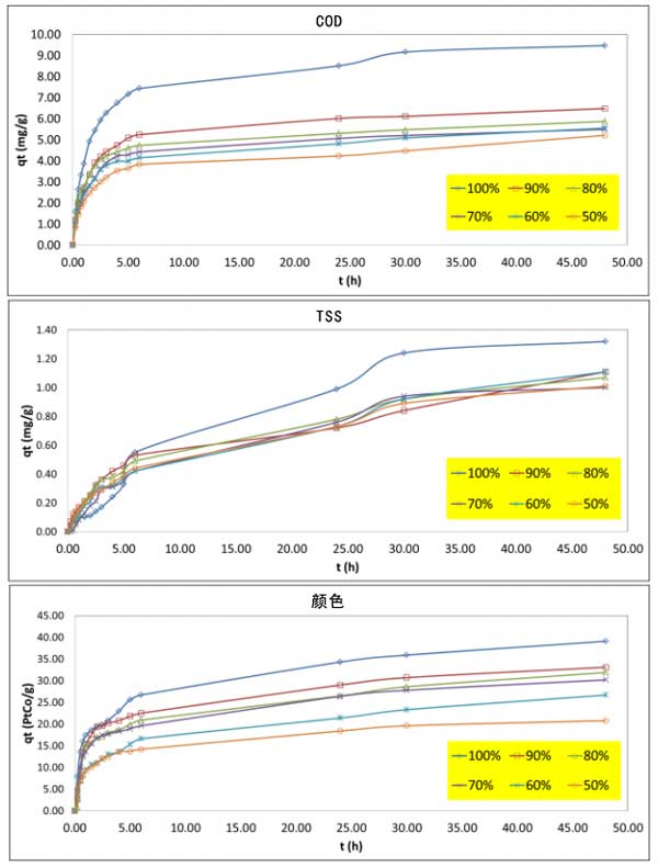 在不同溫度下,棕櫚油廢水濃度如圖2所示。所有初始濃度下的COD、TSS和顏色均顯示出隨接觸時間增加的吸附吸收。在早期,吸收迅速增加,表明有大量活性位點可用。然后,在達到平衡時,它最終顯示出飽和曲線,這可能是由于吸附劑表面的單層污染物覆蓋。在所研究的操作條件下,吸附吸收或活性炭吸附的污染物量在30小時的平衡時間(圖2)達到最大值。當(dāng)廢水濃度從50%增加到100%時,顏色也會發(fā)生變化。然而,隨著廢水濃度的增加,COD、TSS和色度去除率降低。這一現(xiàn)象表明,除了由于活性炭吸附大量污染物的能力有限外,由于活性炭上用于處理濃縮棕櫚油廢水的活性位點堵塞,污染物的吸附量減少。