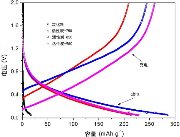 充放電曲線評(píng)估了活性炭的的電化學(xué)性能,不同溫度活化的活性炭電極如圖3所示。CD測(cè)試是在0.25C的電流密度速率下進(jìn)行的;罨瘻囟忍岣吡顺潆娙萘;钚蕴繕悠返母叱潆娙萘繛260.36mAh/g-1,而炭化料樣品的低充電容量為1.98mAh/g-1。這是因?yàn)榛罨臉悠房梢晕蘸芏嗟匿囯x子。放電曲線顯示三個(gè)不同的電位區(qū)域,這可能歸因于不同的機(jī)制。0到0.12V的區(qū)域?qū)?yīng)于鋰離子從隨機(jī)取向的小分子堆疊中的微孔中脫出。0.12到0.8V的區(qū)域歸因于鋰離子從無(wú)序石墨烯層中脫出。高于0.8V的區(qū)域?qū)?yīng)于鋰從各種邊緣位置或石墨烯層中含H-/O官能團(tuán)的脫嵌。