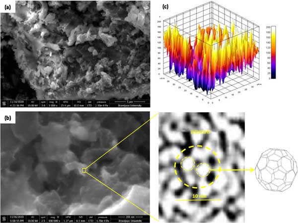 圖1:(a)放大5000倍的活性炭表面形態(tài)(b)活性炭?jī)?nèi)的富勒烯簇(c)表面電荷。