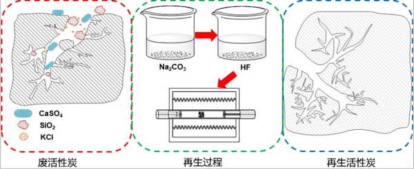 活性炭在燒結(jié)煙氣處理后的再生,采用了Na2CO3溶液、HF溶液和CO2的新型連續(xù)處理方法可以有效地從燒結(jié)煙氣凈化過程中再生廢活性炭。無機(jī)化合物如CaSO4和SiO2以及KCl的沉積導(dǎo)致活性炭失活,Na2CO3溶液可以將CaSO4轉(zhuǎn)化為CaCO3并去除水溶性化合物,如KCl。硫轉(zhuǎn)化率首先顯著增加,然后隨著Na2CO3濃度的增加變化減慢。當(dāng)Na2CO3濃度為0.5mol/L時,硫轉(zhuǎn)化率自由基高達(dá)94.6%。另外在各種溶劑濃度和溫度都達(dá)到較好的水平,總體再生效率可達(dá)111%