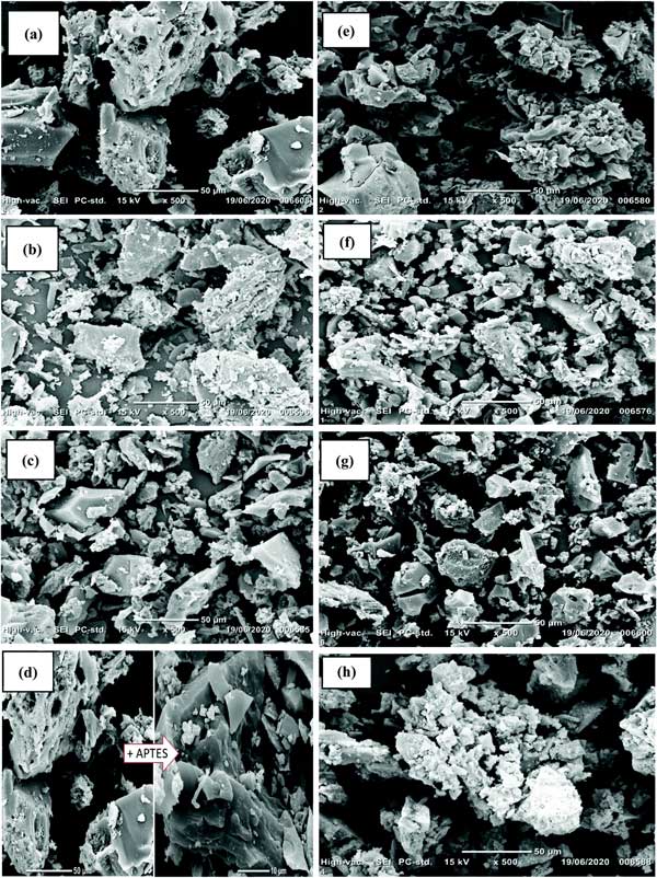 材料的SEM圖像在圖1中給出;钚蕴烤哂胁痪鶆虻墓饣砻,粒徑約為50μm(圖1a)。在用硝酸和過氧化氫進行氧化處理后,氧物質(zhì)(羧基和硝酸鹽基團)被接枝,導(dǎo)致活性炭-OH的表面比活性炭更粗糙(圖1e)。通過APTES處理接枝氨基硅烷是成功的:活性炭-APTES和活性炭-OH-APTES表面分別比活性炭和活性炭-OH更光滑(圖1d和f)。裂縫和不均勻的空腔可用作氟化物的吸附位點。存在的粗糙表面和大量白色顆粒證實了Al顆粒的添加(圖2c、g和h)。這些白色顆?梢詫(yīng)于結(jié)合到材料表面的不同形狀和尺寸的Al納米顆粒的不同簇。