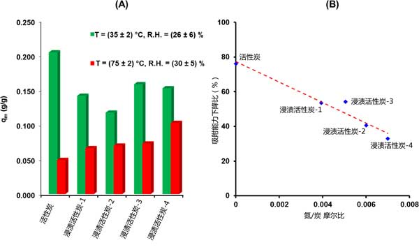 甲基碘吸附容量的降低程度取決于活性炭的性質(圖2(A))。正如預期的那樣,對于未浸漬的吸附劑觀察到有害的影響,其中僅已知不涉及CH3I吸附的特定相互作用。更準確地說,當從活性炭材料的第一組條件轉移到第二組條件時,概述了大約76%的吸附容量下降(圖2)。在這方面,為了克服與水蒸氣和溫度相關的影響,三乙二胺浸漬是必不可少的。最近,由于水對三乙二胺分子具有很強的親和力,因此三乙二胺浸漬可以通過釋放載體的活性位點來提高活性炭的保留性能]。此外,與其他機制(尤其是物理吸附)相比,化學吸附甲基碘的比例隨著溫度升高而增加。然后,三乙二胺與甲基碘的化學反應性將在較高溫度下增強。得到的結果(圖2)表明隨著氮含量的增加,在“惡劣條件”下的保留性能逐漸提高。因此,以浸漬中含量最高為特征的活性炭-4吸附劑的吸附容量僅降低了33%。更準確地說,可以推斷出所有考慮的吸附劑的減少幅度和摩爾比之間的準線性關系(圖2B)。根據(jù)這種關系,似乎需要浸漬,以確保在更嚴格的條件下更牢固地固定甲基碘。