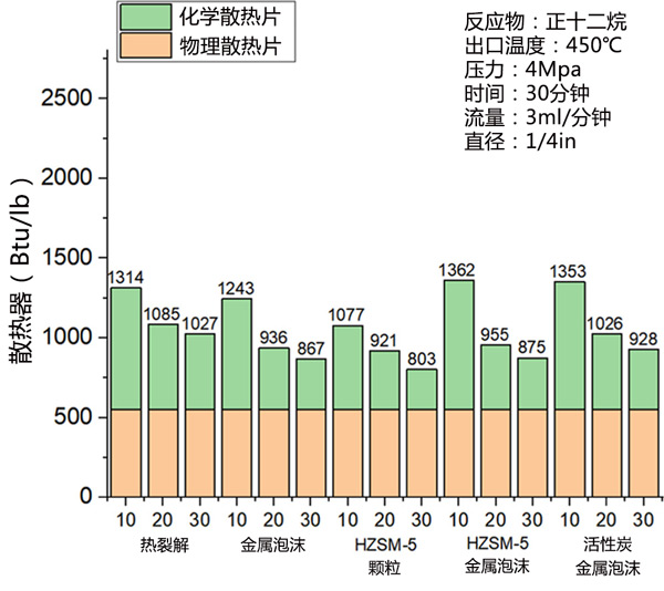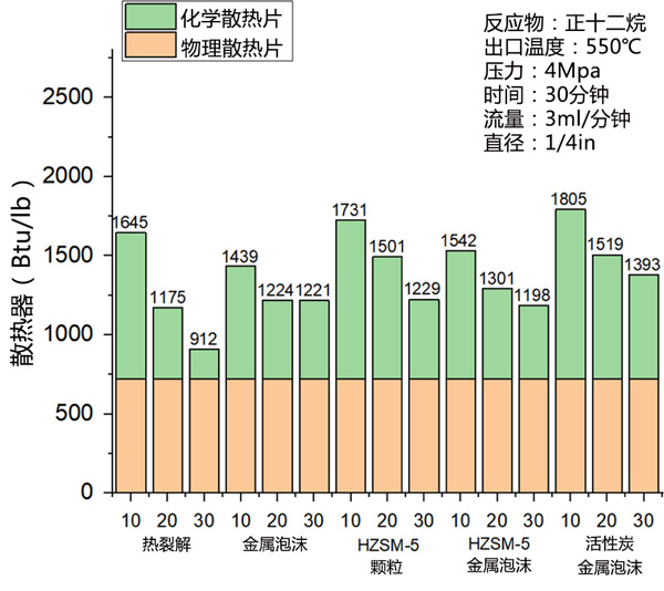 熱裂解和催化裂解產(chǎn)生的散熱片-十二烷在圖2顯示,溫度為450℃,壓力為4MPa。由于散熱器與使用的飛機冷卻技術(shù)直接相關(guān),因此應慎重考慮。測量的散熱器值在10分鐘內(nèi)取平均值,通過將它們除以質(zhì)量流量將瓦特轉(zhuǎn)換為Btu/lb單位。反應10分鐘后,HZSM-5/金屬泡沫和活性炭/金屬泡沫樣品的散熱片分別為1342和1353Btu/lb。兩種催化劑在10分鐘內(nèi)都表現(xiàn)出高散熱片。僅金屬泡沫和HZSM-5顆粒的初始散熱器分別為1243和1077Btu/lb。僅涉及金屬泡沫的反應的熱沉低于熱裂解的熱沉。由于反應溫度低,泡沫不作為金屬催化劑并占據(jù)反應空間30分鐘。HZSM-5顆粒在反應的前30分鐘內(nèi)導致最低的熱沉,因為氣體產(chǎn)率低且產(chǎn)生大量線性石蠟。相比之下,熱裂化的散熱器保持在高值30分鐘。因此,在低反應溫度下,酸和金屬催化劑均表現(xiàn)出低催化效率并占據(jù)反應空間。