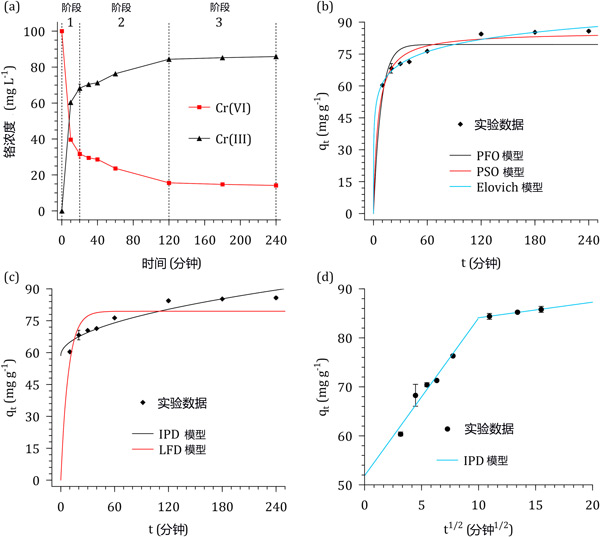 圖2:(a)六價(jià)鉻溶液和浸漬活性炭接觸時(shí)間對Cr濃度和形態(tài)的影響。(b)反應(yīng)動力學(xué)模型、(c)擴(kuò)散模型和(d)線性化的顆粒內(nèi)擴(kuò)散模型。