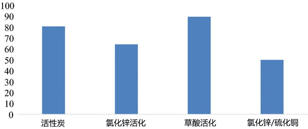 原材料用蒸餾水洗滌數(shù)次,然后干燥24小時,然后將原料通過電動研磨機(jī)獲得的粉末。將100g樣品與1L草酸(20%w/w)一起回流180分鐘,然后讓混合物在室溫下冷卻。將出售的部分通過過濾分離,以除去任何過量的草酸,將該固體與250mL/2M鹽酸一起加熱90分鐘。然后,對新混合物進(jìn)行多次過濾并用蒸餾水沖洗以得到干凈的固體,以除去樣品中存在的任何水分,將固體在130℃的烘箱中放置30小時。最后,為保證樣品的均勻性,將干燥的固體研磨過篩,得到草酸活化的活性炭粉末。對含有100g原料和1L20%w/w氯化鋅酸性溶液的混合物以及100g原料和20%w/w氯化鋅酸性溶液和50g銅的混合物重復(fù)相同的程序。得到的氯化鋅活化的活性炭和氯化鋅/硫化銅活化的活性炭?傆嬋N活化方式制成的活性炭吸附劑。