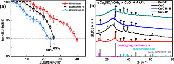 銅改性活性炭通過水洗和吹掃氣體法進行再生。為此,活性炭樣品首先在100℃的熱空氣中活化3小時。然后用去離子水浸泡清洗4-5次,放入電熱風烘箱中110-120℃烘干。之后,將樣品置于氮氣氣氛下的管式爐中,并使用程序升溫控制器升高溫度。考慮到通過在180℃下烘烤獲得的材料,溫度首先設(shè)定在20-180℃。之后,停止加熱,將樣品冷卻至室溫。取出樣品,停止氮氣流,對再生材料進行測試。如圖3a所示,R的再生效率(R為再生吸附劑與新鮮吸附劑的穿透時間之比)在一個再生循環(huán)后為65%。在第二次再生循環(huán)后,樣品恢復(fù)效率R達到60%,證實了活性炭吸附劑對去除AsH3具有合理的再生能力。為了確定活性炭吸附劑再生后表面相的變化,通過XRD分析活性炭吸附劑。如圖3b所示,再生后活性炭-R1中35.6°、38.8°和61.8°的CuO衍射峰強度明顯增加,但沒有Cu2(NO3)峰被找到。這表明在再生過程中回收的一些CuO物種可能被中間體Cu2(NO3)(OH)3轉(zhuǎn)化。此外,活性炭-R1樣品中As2O3在28.0°、32.2°、35.5°、42.6°、46.4°、55.0°和59.6°處的結(jié)晶峰明顯減弱。推測中間體Cu2(NO3)(OH)3向吸附活性中心CuO的轉(zhuǎn)變和結(jié)晶As2O3的分離可能是活性炭吸附劑再生性能好的原因。