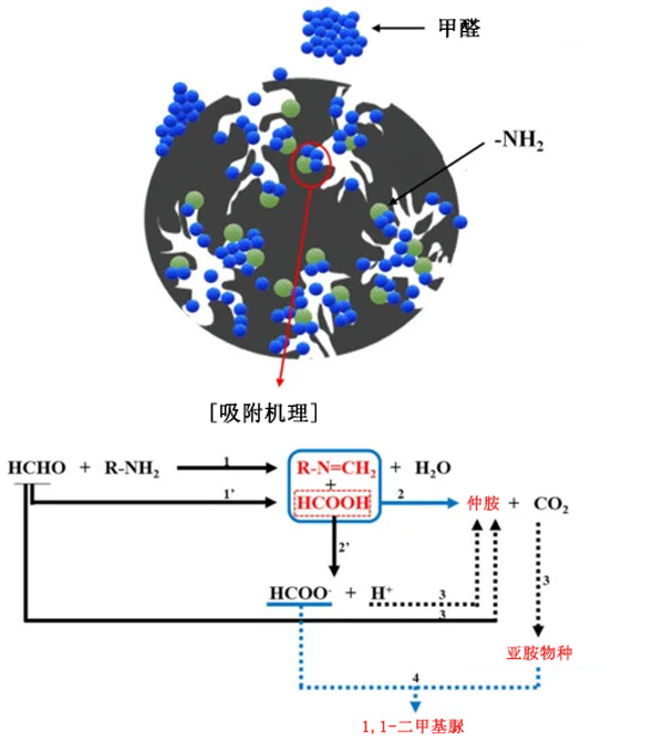 圖2:胺類在活性炭上對甲醛的作用機制。