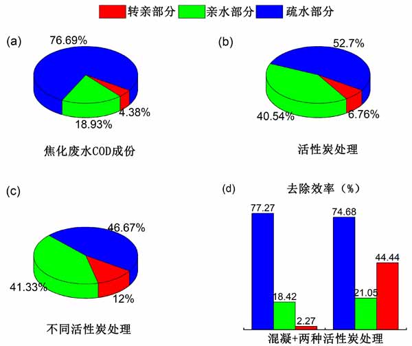圖1:(a)焦化廢水中溶解有機物組合的比例(b、c)混凝和活性炭處理后溶解有機物組合的比例(d)混凝聯(lián)合活性炭處理對溶解有機物組合的去除效率。