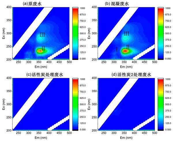 圖2:(a)原廢水、(b)混凝流出物、(c)活性炭吸附流出物和(d)第二種活性炭吸附流出物的EEM光譜。
