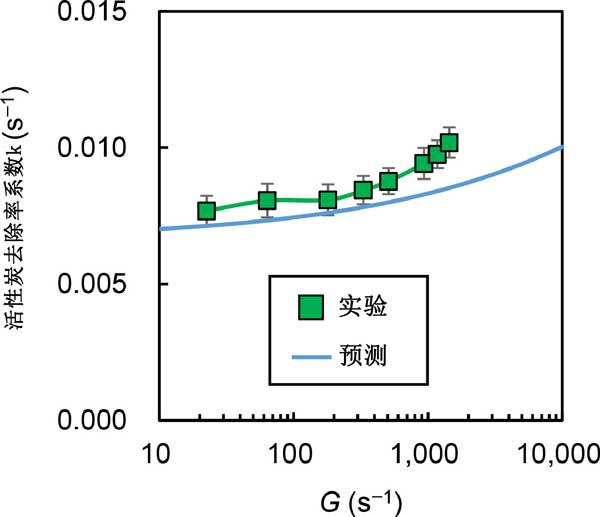 我們研究了混合強度對去除率系數(shù)(k)的影響(圖1)。我們繪制了實驗數(shù)據(jù),實線顯示了方程式預(yù)測的值。實驗結(jié)果和預(yù)測結(jié)果都表明,去除率系數(shù)隨著混合強度的增加而增加,但在G>1000s-1的范圍內(nèi),實驗結(jié)果的增加率變得更陡峭,偏離預(yù)測的速率系數(shù)值。我們假設(shè)偏差背后的急劇增加是由于活性炭顆粒在高混合強度下的分解(在給炭時輕度聚集)。這些預(yù)測是在假設(shè)活性炭顆粒的尺寸(部分聚集在原料懸浮液中)在給炭后保持不變的情況下做出的,因為原位顆粒尺寸測量是不可能的。如果這個假設(shè)是正確的,那么去除率系數(shù)隨著混合強度的急劇增加,在高G對于在給炭時已經(jīng)處于分散狀態(tài)的活性炭顆粒,不應(yīng)觀察到-值范圍。為了驗證這一假設(shè),我們使用了非聚集活性炭,其粒徑在分散處理前后沒有變化,我們在不同的混合強度。我們沒有觀察到隨著活性炭混合強度的增加,去除率系數(shù)的急劇增加,強烈表明觀察到的活性炭的急劇增加是由于高混合條件下的顆粒分解。