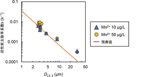 二價錳離子(Mn2+)在配水系統(tǒng)中被氧化成黑色氧化錳,是飲用水中出現(xiàn)美觀問題的主要原因。為了去除可溶性二價錳我們研究了游離氯催化氧化去除活性炭表面上的二價錳,并發(fā)現(xiàn)當使用微米級活性炭時效果比較好。在此,我們新推導(dǎo)出了催化反應(yīng)去除痕量物質(zhì)的動力學(xué)模型,并將其應(yīng)用于二價錳去除。