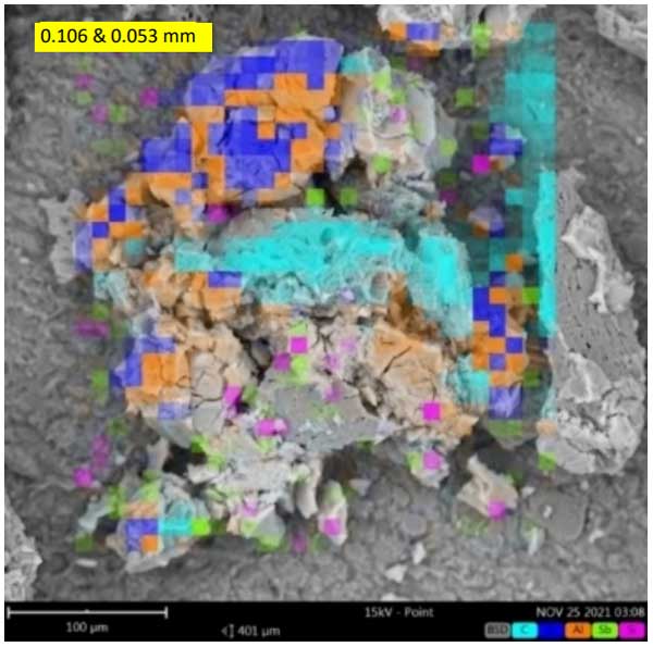 水性介質(zhì)最終溶液中的元素通過(guò)測(cè)定。溶液中存在的元素可以來(lái)自電極氧化、活性炭孔隙中的元素提取以及水介質(zhì)中使用的硬水中的元素。在測(cè)試中,由于電凝過(guò)程中的廣泛氧化,F(xiàn)e水平低于Fe量化限值(0.01mg/L)。使用0.106毫米大小的活性炭顆粒的電凝工藝在鋁電極上實(shí)現(xiàn)了比鐵電極更均勻的涂層,如750倍和600倍放大率下的活性炭顆粒的SEM圖像所示(見(jiàn)圖1);钚蕴拷Y(jié)果中存在的多元素在王水中消解并通過(guò)ICP-OES表征,通過(guò)電極的氧化、活性炭顆粒的凝聚和水介質(zhì)硬水中所含金屬的吸附而增加。
