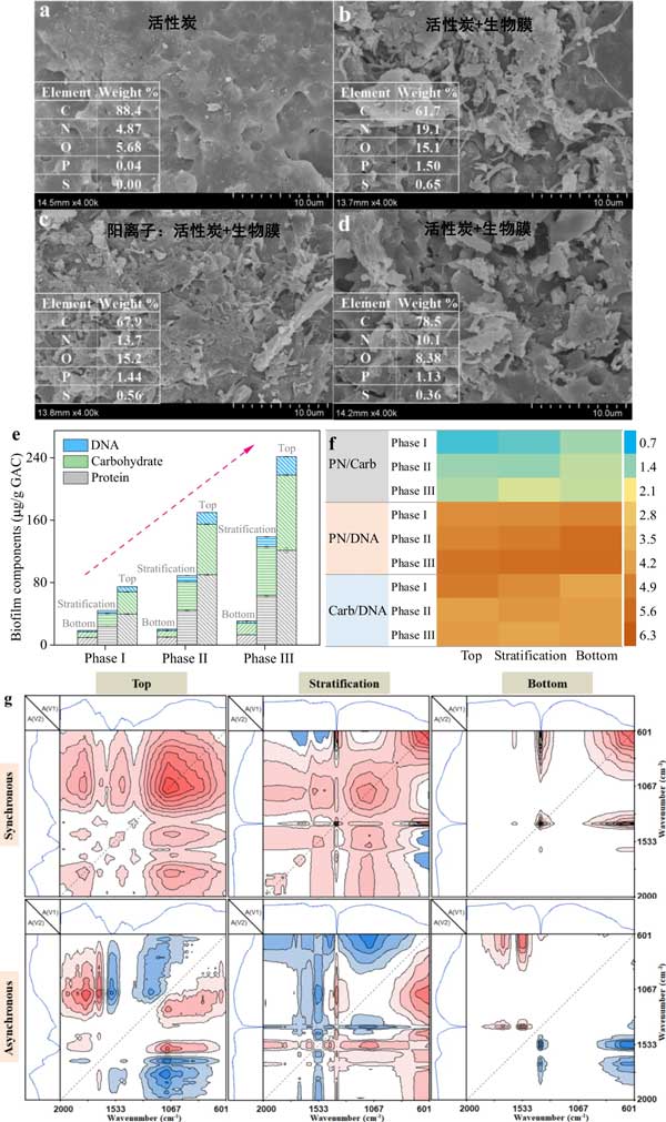 活性炭是生物膜生長的優(yōu)良載體,它可以快速從液相中吸收有機物和營養(yǎng)物質(zhì),用于生物膜中微生物的新陳代謝。圖1顯示了有和沒有生物膜的活性炭形態(tài)動力學、生物膜組分的濃度和反應器不同位置的官能團。活性炭中的元素主要包括碳(C,88.4%)、氮(N,4.87%)、氧(O,5.68%),以及少量的磷(P,0.04%),活性炭表面為比較順利。生物膜形成后,活性炭表面附著大量生物質(zhì),變得更加粗糙。由于生物膜中蛋白質(zhì)、碳水化合物和DNA的積累,包括N、O和P在內(nèi)的主要元素的比例顯著增加(圖1e)。值得注意的是,硫元素也被檢測到,這應該有助于活性炭和生物膜對LAS(磺酸基團)的吸附。