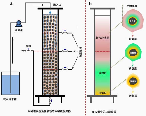 圖2:a活性炭動態(tài)生物膜反應器示意圖和b灰水期間活性炭反應器中的功能區(qū)和生物膜層在顯著分層位置處理。