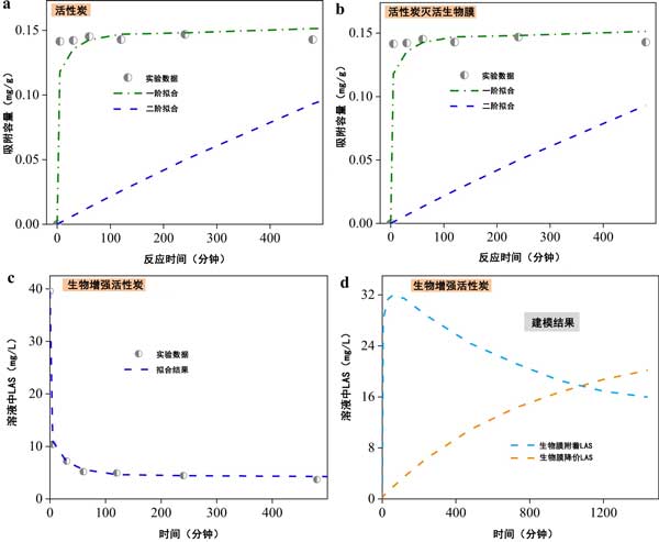 圖3:磺酸基團去除動力學在活性炭、b滅活生物膜-活性炭、c生物增強活性炭和d生物增強活性炭中的LAS去除動力學的批量實驗。