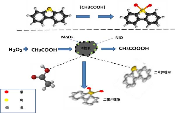 為了更好地理解H2O2/CH3COOH體系在NiO-MoO3活性炭催化劑存在下的氧化脫硫機理,假設存在NiO作為助催化劑,而MoO3作為活性相,反應由MoO3引發(fā),涉及過氧化氫的水解裂解產(chǎn)生強氧化劑(活性羥基自由基(OH•),這些活性自由基攻擊乙酸產(chǎn)生過乙酸,為二苯并噻吩提供氧氣生產(chǎn)二苯并(含有S=O)并進一步攻擊產(chǎn)生二苯并噻吩(含有O=S=O)。