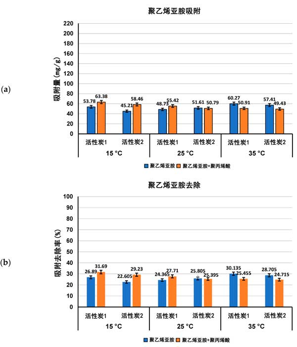 圖1:聚丙烯酸吸附量(a)及其從活性炭表面去除的百分比(b)在單一和混合吸附物系統(tǒng)中,在三個檢測溫度pH值3下。