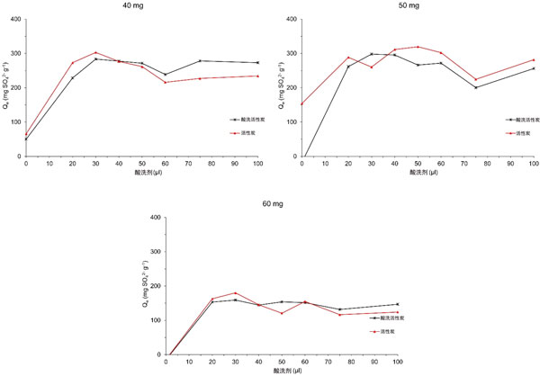 圖1:添加酸洗劑的活性炭用量為40、50和60mg時的硫酸根離子吸附能力。