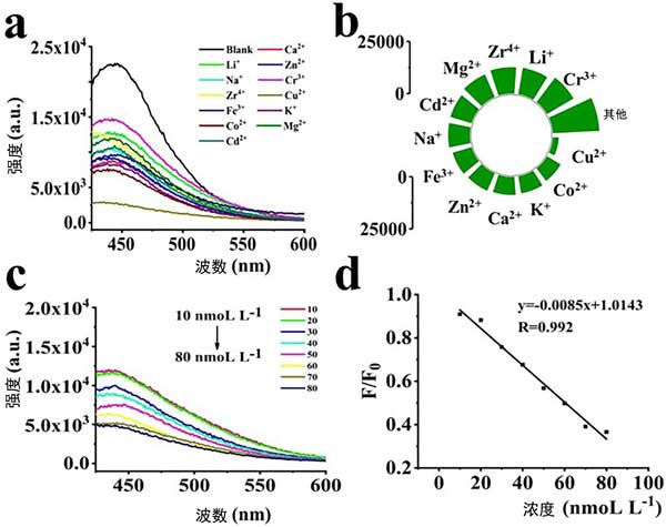 納米活性炭點(diǎn)對(duì)金屬離子的選擇性至關(guān)重要,添加納米活性炭點(diǎn)后檢查金屬離子的熒光強(qiáng)度。當(dāng)將納米活性炭點(diǎn)添加到空白溶液和含有12種金屬離子的溶液中時(shí),發(fā)生熒光發(fā)射,如圖2a和b所示。然而,當(dāng)添加Cu2+時(shí),納米活性炭點(diǎn)的熒光強(qiáng)度明顯下降,熒光強(qiáng)度下降了87.1%,表明發(fā)生了明顯的熒光猝滅。隨著Cu2+濃度從10nM增加到80nM,納米活性炭點(diǎn)的熒光強(qiáng)度隨著Cu2+濃度的增加而降低,如圖2c所示。線性相關(guān)系數(shù)(r)為0.992(圖2d)。檢測限(LOD)計(jì)算為3r/S,其中r代表空白信號(hào)標(biāo)準(zhǔn)偏差(n=11),n指對(duì)空白樣品進(jìn)行重復(fù)測量的次數(shù),S(指斜率)的線性曲線)。因此,Cu2+的納米活性炭點(diǎn)的LOD計(jì)算為2.83nmol/L-1。一些報(bào)道的材料可以同時(shí)檢測兩種或多種金屬離子。例如,摻雜氮和硫制備的基于羊毛角蛋白的熒光CQD可以檢測Cr6+和Fe3+。相比之下,鴿糞合成的氮硫共摻雜熒光納米活性炭點(diǎn)可以檢測Hg2+和Fe3+。在我們的案例中,納米活性炭點(diǎn)對(duì)Cu2+的檢測表現(xiàn)出高選擇性。納米活性炭點(diǎn)的表面有機(jī)基團(tuán)(-COOH和-NH2)具有很強(qiáng)的選擇性與Cu2+結(jié)合的能力,導(dǎo)致納米活性炭點(diǎn)聚集,產(chǎn)生較高的猝滅熒光強(qiáng)度,從而導(dǎo)致納米活性炭點(diǎn)的熒光強(qiáng)度猝滅。當(dāng)Cu2+濃度在10至80nM范圍內(nèi)時(shí),熒光強(qiáng)度表現(xiàn)出良好的線性相關(guān)性,如圖2d所示。