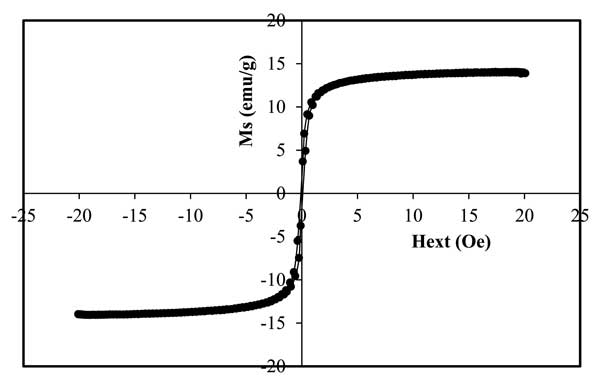 復(fù)合磁性材料的磁性測量顯示出室溫下的超順磁性。圖2顯示了在24.8℃溫度下測量的活性炭磁鐵礦材料的磁滯回線的存在。磁性活性炭的飽和磁化強度(Ms)值為14.06emu/g。磁性復(fù)合材料合成通常會降低純磁性材料的飽和磁化強度(Ms)值。