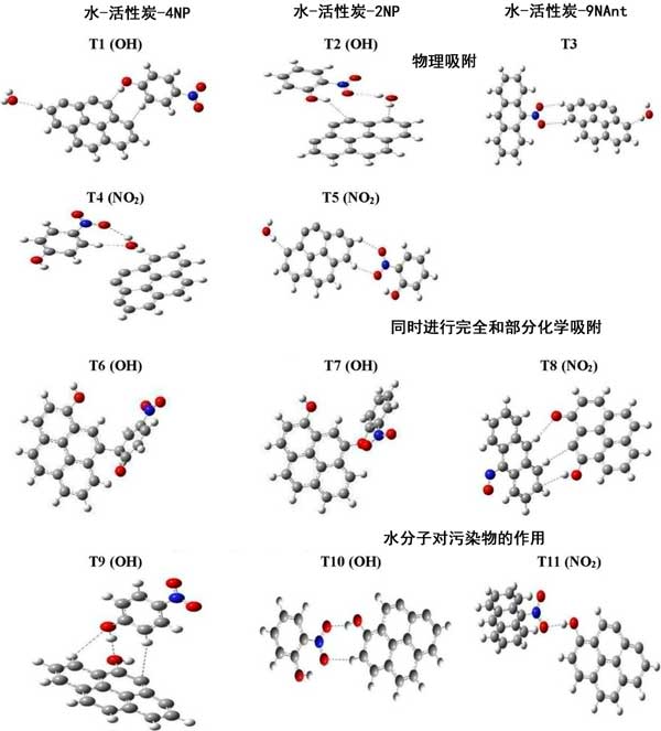 圖1:污染物和水與活性炭連接形成兩個分子聚集體的優(yōu)化結(jié)構(gòu)。