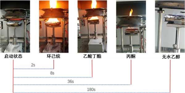 圖3顯示了四個(gè)樣品的初始燃燒火焰和點(diǎn)火時(shí)間。可以看出,四個(gè)樣本的點(diǎn)火時(shí)間按照環(huán)己烷<乙酸丁酯<丙酮<純無(wú)水乙醇的順序遞增。顯然,吸附VOCs后的樣品更易燃燒,其中環(huán)己烷樣品是最容易被點(diǎn)燃的一種。從火焰尺度來看,吸附樣品的火焰高度較大,燃燒強(qiáng)度較強(qiáng)。此外,純無(wú)水乙醇樣品的火焰顏色為淺藍(lán)色,表明純無(wú)水乙醇燃燒時(shí)樣品的表面溫度低于其他三個(gè)吸附樣品。
