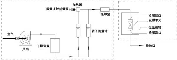 動(dòng)態(tài)吸附實(shí)驗(yàn)在室溫(25℃)下進(jìn)行。實(shí)驗(yàn)裝置由氣體分配系統(tǒng)和吸附系統(tǒng)兩部分組成。吸附系統(tǒng)由恒溫箱和吸附單元組成。檢測口位于吸附系統(tǒng)之前和之后。動(dòng)態(tài)法測定活性炭對脈沖負(fù)荷緩沖性能的裝置如圖1所示。本實(shí)驗(yàn)以乙醇或二甲苯為單一檢測對象。氣體分配系統(tǒng)包括風(fēng)扇、干燥裝置、轉(zhuǎn)子流量計(jì)、微注射計(jì)量泵、加熱器和緩沖室。使用FT-IR傅里葉氣體分析儀作為測量設(shè)備。在氣體分配系統(tǒng)中,在短時(shí)間內(nèi)(2分鐘和5分鐘),微注射計(jì)量泵的注射量迅速增加到原始體積的預(yù)定倍數(shù)(10倍和20倍),以產(chǎn)生脈沖負(fù)載。在吸附系統(tǒng)中,吸附單元內(nèi)放置活性炭。吸附單元的直徑為31mm;钚蕴康奶畛涓叨确謩e為2cm、4cm、6cm、8cm。將吸附裝置置于恒溫箱內(nèi)。吸附劑和吸附物的入口空氣保持在室溫。進(jìn)行了吸附劑在室溫下吸附吸附質(zhì)的脈沖加載實(shí)驗(yàn)。潔凈空氣通過干燥裝置后,利用轉(zhuǎn)子流量計(jì)將其按特定比例分成兩個(gè)通道。通過微注射泵將特定濃度的乙醇或二甲苯氣體注射到氣體中。另一種氣體用作稀釋氣體。兩種氣體流入緩沖室,完全混合后進(jìn)入恒溫箱。穩(wěn)定的氣體按照實(shí)驗(yàn)設(shè)定的濃度、流量和溫度進(jìn)入吸附單元。在通過吸附單元之前和之后測量乙醇或二甲苯的濃度。