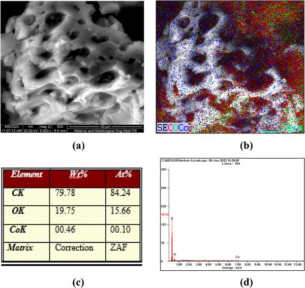 此外,EDX分析結(jié)果表明碳含量高(C=79.78%)和化學(xué)結(jié)合氧(O=19.75%),如圖1和2所示。5c和5d。還存在少量鈷(Co=0.46%),它是在碳化過(guò)程中出現(xiàn)的并且沒(méi)有得到最佳轉(zhuǎn)化,并且樣品洗滌過(guò)程也不是最佳的。下圖中,顯示了樣品的元素分布圖,其中碳為紅色,氧為綠色,鈷為藍(lán)色,分布均勻,如圖3b所示。這會(huì)影響吸附孔隙結(jié)構(gòu)的形成。