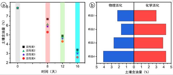 實驗開始時,指定了兩個地塊:第一個地塊作為受石油污染土壤的對照,而第二個地塊用于測試活性炭樣品以進行修復(fù)。每個地塊面積為4平方米(2.0米×2.0米),每個地塊約有50公斤土壤。通過在空氣中兩階段熱解,用氫氧化鉀活化生物質(zhì)植物殘渣產(chǎn)生的活性炭被引入受石油污染的土壤中。施用活性炭后,土壤被適當(dāng)潤濕并通氣。處理后8至16天內(nèi)定期收集土壤樣本以評估含油量。土壤樣本中的含油量采用重量法測定,包括在索氏提取器中使用熱己烷從土壤樣本中提取碳?xì)浠衔铩?/p>