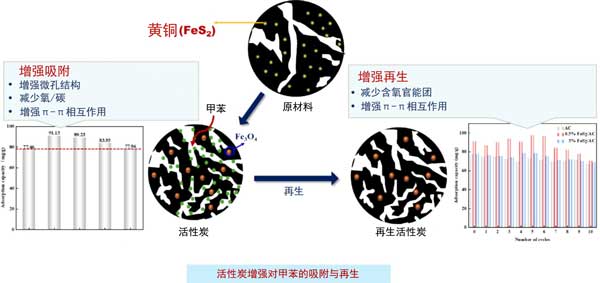 研究發(fā)現(xiàn),添加0.5%的黃鐵礦能顯著提升活性炭的甲苯吸附能力和再生穩(wěn)定性。與未改性活性炭相比,改性后的活性炭甲苯吸附容量增加了17.64%,且在五個(gè)再生循環(huán)后仍能保持超過77.59%的初始吸附容量。