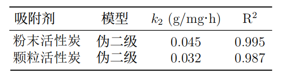 吸附過程符合偽二級(jí)動(dòng)力學(xué)模型(R2>0.99),表明化學(xué)吸附為主導(dǎo)機(jī)制。吸附速率常數(shù)k2隨粒徑減小而增加,反映了粉末活性炭的快速吸附特性(圖2)。