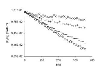 為了獲得關(guān)于活性炭的化學(xué)性質(zhì)的更多信息,就其酸性-堿性和氧化還原性質(zhì)而言,研究了溶液的pH和過氧化氫中活性炭表面的化學(xué)修飾的影響。 。對于該反應(yīng)混合物與過氧化物濃度0.100mol L的固定組合物-1和CAT等于2,00x10 -3克·毫升-1 在298K的溫度下發(fā)現(xiàn):在2-10個(gè)pH單位的溶液范圍內(nèi),初始反應(yīng)速率沒有顯著變化。該結(jié)果與Bohem滴定法給出的活性炭中官能團(tuán)的組成一致,其中活性酸基團(tuán)與堿性基團(tuán)相比是非常低的比例。強(qiáng)氧化劑,如高錳酸鉀和過氧化氫,會大大改變影響過氧化氫的表面(圖1),從而可以推斷活性炭表面存在還原基團(tuán)作為過氧化氫的活性位點(diǎn);钚蕴勘砻娴幕瘜W(xué)處理按以下方式進(jìn)行:用HNO3濃度5mol L-1 6個(gè)小時(shí),用KMnO 4濃度0.08mol L-1在酸H 2 SO 4 濃度為0.5mol L-1 4小時(shí)用H 2 ö 2 的30%72小時(shí)。在每次處理結(jié)束時(shí),將活性炭置于索氏提取器中一周,直到保證恒定的pH值。最后將活性炭在110℃下干燥至不再減輕重量,然后儲存在干燥器中。