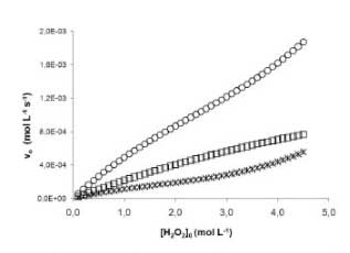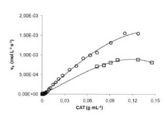 在圖3中關(guān)系決定于過氧化氫的初始濃度的反應(yīng)初速度的變化,當(dāng)活性炭(CAT)的質(zhì)量-體積是比:(1)1.0×10 -3克毫升- 1,(b)2.0×10 -3 g mL -1和(c)4.0×10 -3 g mL -1,溫度為298 K.