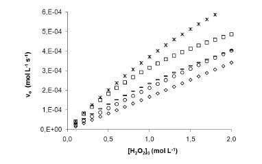 在圖4中溫度的效果示于初始反應(yīng)速率,這取決于過氧化氫的初始濃度時(shí)活性炭的質(zhì)量-體積比為2,00x10 -3克·毫升-1。