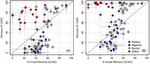 圖2.比較在(A)等效質(zhì)量基礎(chǔ)和(B)等效表面積基礎(chǔ)上進行的批量實驗測量的每種微污染物與P-CDP或活性炭接觸5分鐘后的百分比去除率。每個面板中的誤差線代表五次測量的標準偏差。顏色表示在進行實驗的pH(pH = 7)下微污染物的電荷狀態(tài)。