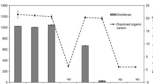 使用活性炭除去雙氯芬酸鈉是定性高效的,通過零吸收和低濃度的DOC的,并且在通過所獲得的色譜中沒有檢測到雙氯芬酸鈉。得在所研究的處理階段中,在活性炭上的吸附導(dǎo)致最顯著的雙氯芬酸鈉去除。因此,雙氯芬酸鈉沒有水樣中的這個(gè)階段(LOD之后檢測 = 2 μg L−1)。考慮到所述方法的定量限為3 μg L−1,通過活性炭除去雙氯芬酸鈉的至少99.7%。因?yàn)闆]有研究活性炭的破裂曲線,所以活性炭的結(jié)果可以被認(rèn)為是定性的。然而,為了研究在大型水處理廠中去除雙氯芬酸鈉,必須改進(jìn)該方法以達(dá)到較低的檢測限(約μg L−1)。