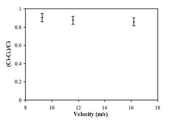 活性炭吸附劑的吸附容量,目前高流速雙氣固旋風(fēng)分離器的吸附過(guò)程作為一種動(dòng)員氣體粒子系統(tǒng)。根據(jù)活性炭的尺寸,流速和回收來(lái)檢查注入的顆;钚蕴康募妆饺コ。不幸的是,如圖1所示,一些甲苯可能殘留在旋風(fēng)器內(nèi)壁上,并且供應(yīng)活性炭顆粒的鞘空氣可能稀釋主流。計(jì)算效率時(shí)可能會(huì)導(dǎo)致一定程度的錯(cuò)誤。使用簡(jiǎn)單的質(zhì)量平衡評(píng)估這種自然損失。但是,錯(cuò)誤率低于沒(méi)有活性炭吸附劑進(jìn)料的背景測(cè)試的20%。在整個(gè)測(cè)試評(píng)估過(guò)程中,這些誤差被考慮到去除效率的數(shù)值考慮中。