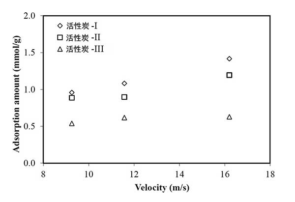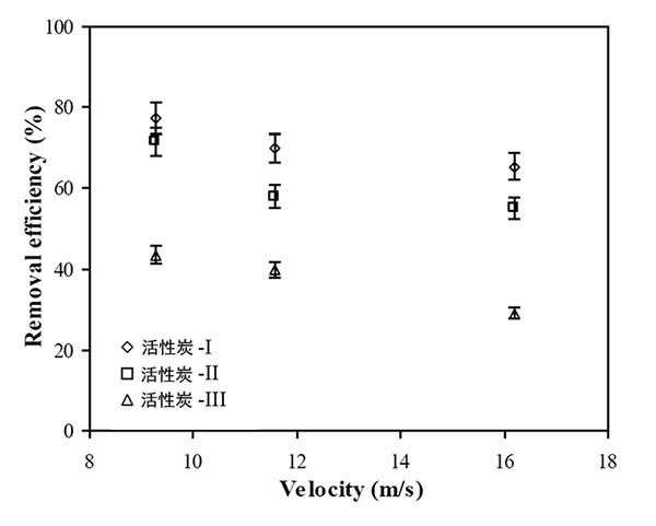 流速同時(shí)影響氣體吸附和活性炭回收,因?yàn)樗婕皻怏w和活性炭顆粒的混合程度、。圖3在各種活性炭吸附劑尺寸下,氣體去除效率和流量之間呈現(xiàn)出輕微的反比關(guān)系。最小的吸附劑(活性炭-1)以9.26米/秒除去77.4%的甲苯蒸氣,然后以16.2米/秒降至65.4%。微粒活性炭吸附劑捕獲沿著旋風(fēng)分離器的流動(dòng)路徑行進(jìn)的甲苯蒸氣。雖然在前面的的內(nèi)容說(shuō)過(guò)吸附量以高速增加,但是氣體去除效率相當(dāng)?shù)。這是因?yàn)樵诟吡髁肯录妆降慕^對(duì)體積要高得多。因此,即使活性炭吸附得更多,更多的氣體分子傾向于流出而沒(méi)有在內(nèi)部吸收。因此,關(guān)于顆;厥蘸蜌怏w去除效率的最佳流量必須通過(guò)在各種操作條件下的眾多實(shí)驗(yàn)來(lái)確定。