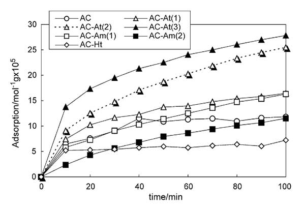 實(shí)驗(yàn)條件:在N2中使用210ppm的甲硫醇作為甲硫醇?xì)怏w。活性炭的制備,活性炭通過(guò)碳化隨后活化制備。用蒸汽進(jìn)行活化。用HNO3/H2SO4溶液進(jìn)行活性炭的酸處理。將1克活性炭在100立方厘米HNO3/H2SO4溶液中在室溫下攪拌0.5小時(shí)。過(guò)濾分離經(jīng)過(guò)處理的活性炭,并在超聲條件下用去離子水洗滌數(shù)次,直到水的pH值達(dá)到5以上。然后將活性炭在100℃空氣中干燥12小時(shí),在150℃下真空干燥1小時(shí)。用HNO3,HNO3/H2SO4(1/1比例)和HNO3/H2SO4(1/3比率)處理的活性炭分別表示為AC-At(1.2.3)。胺化合物對(duì)活性炭的改性通過(guò)十六胺的吸附來(lái)進(jìn)行。將活性炭浸入十六烷胺/乙醇溶液中并在室溫下攪拌30分鐘。然后過(guò)濾分離活性炭并在室溫下真空干燥2小時(shí)。由4×10-6和3.3×10-5摩爾m-3十六胺溶液制備的活性炭分別表示為AC-Am(1.2)。活性炭(AC-Ht)的熱處理在Ar氣氛中在600℃下進(jìn)行2小時(shí)。