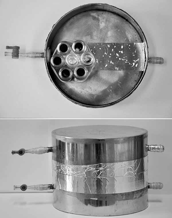將0.15g活性炭或生物炭稱入20ml透明頂空小瓶中。將三次重復(fù)(每次總共6個(gè)小瓶)放入容器中。容器由兩個(gè)不銹鋼圓柱形盒子構(gòu)成,每個(gè)15厘米內(nèi)徑和4厘米高(圖1)。將5mL純氯化苦液體注入20ml透明頂空小瓶中并放入容器中以產(chǎn)生飽和蒸氣相。將小瓶放入容器后,用鋁帶密封容器。然后將容器置于溫度穩(wěn)定在30℃的培養(yǎng)箱中。孵育3,6,9,12和24小時(shí)后,從培養(yǎng)箱中取出容器。打開容器并在通風(fēng)櫥中通風(fēng)約30分鐘。然后使用與已經(jīng)描述的相同的方法分析活性炭炭或生物炭。