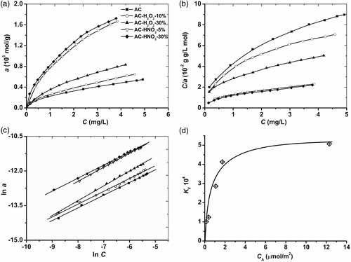 關(guān)于活性炭改性后吸附銅離子上的平衡研究的實(shí)驗(yàn)數(shù)據(jù)繪制在圖2(a)中。該圖顯示最有效的吸附劑是活性炭-HNO 3-5和活性炭-HNO 3-30樣品,去除率R超過50%。在低濃度Cu 2+的范圍內(nèi),低于1.5×10-4 M,R的值高于80%。我們認(rèn)為,這是由于含氧基團(tuán)的高濃度。