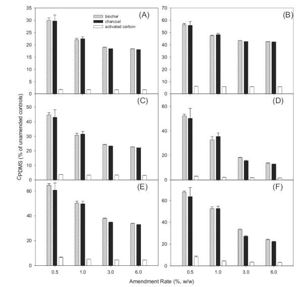 在平衡時(shí),通過(guò)活性炭吸附或隔離PBDEs反映了它們?cè)赑DMS纖維(C PDMS)上檢測(cè)到的水平的變化。在JL沉積物中,隨著活性炭修正,C PDMS顯著下降,并且活性炭的類型之間的減少不同(圖2)。例如,當(dāng)用生物炭以0.5%修正JL沉積物時(shí),C PDMS降低至未沉降沉積物中的水平的30.0-67.8%。木炭(29.7-63.5%)的效果與生物炭相似(圖2)。相比之下,活性炭修正沉積物中C PDMS的下降幅度更大(圖2))。例如,在含有0.5%活性炭的JL沉淀物中,對(duì)于不同的同源物,C PDMS降低至未改良處理的水平的1.8-8.1%。平均而言,添加1.0%的活性炭導(dǎo)致所選BDE同系物的C PDMS降低至對(duì)照水平的1.7-5.9%,這表明活性炭在沉積物中螯合PBDEs的能力遠(yuǎn)遠(yuǎn)高于其他黑碳材料。